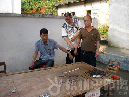4月21日下午,岑溪市公安局三堡派出所民警在三堡鎮平山村處理完一起家庭案件的返回途中,發現有群眾聚集于一路邊民宅平地內有疑似賭博行為。民警立即停車,并靠近偵察打手勢確認,以迅雷不及掩耳之勢沖入屋內,當場抓獲涉賭人員2名,其他賭徒四處逃跑,為防止二次賭博,民警將作賭博用的臺、木椅等賭具當場搗毀。