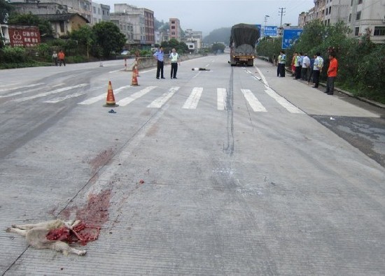 據(jù)了解,當日凌晨3時許,吳某來到馬路鎮(zhèn)的莫某家中幫忙殺豬,在閑聊時,吳某提起其經(jīng)過曇容交警中隊門前路段時,見到路面上有一條可能是被車撞死的狗。莫某一聽,想到那里離自己家不遠,便起了貪念,不顧吳某的阻止,借了吳某的摩托車趕去撿死狗。當莫某到達曇容交警中隊門前路段時,見到了在公路中間的死狗,即連忙拐過去撿,卻沒有注意到后面的駛來的貨車,結(jié)果導致了悲劇的發(fā)生。
