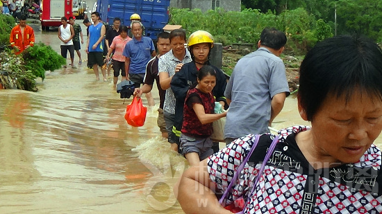 消防官兵幫助群眾度過(guò)山洪封堵路面。