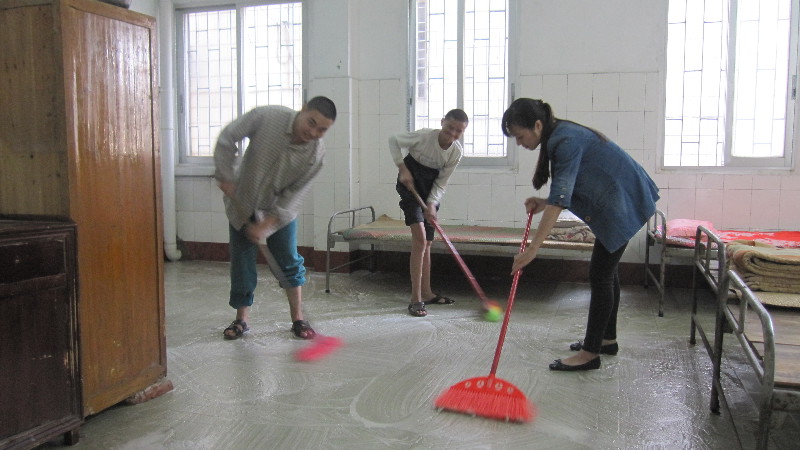在灑滿清潔劑的大房間里,記者和他們一起用掃把使勁搓洗地面??吹接浾吲c他們一起干活,他們都感到好奇,還露出得意的笑容,提醒記者:“掃把要豎著刷才能刷得更干凈!”
