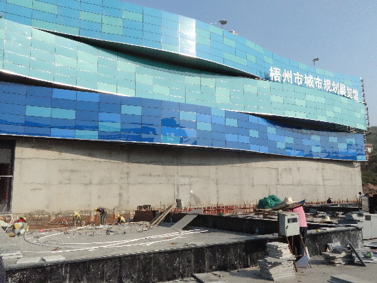 ????10月11日,記者在毅德商貿物流城看到,大批工人正在緊張施工。展覽館的外立面裝飾采用三道層次不同、形態各異的藍色波浪狀玻璃幕墻構成,寓意三江水匯梧州。在展覽館內,施工人員忙著安裝和調試聲、光、電等設備;展覽館外對出廣場的大型音樂噴水池已基本成形,工人們正加緊進行噴水池收尾施工、道路硬化、排水設施鋪設、綠化美化等工作。