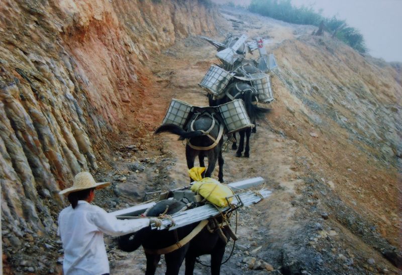 ????負責獅臥山輸電線路改造的黃經理表示,用驢來對山上的基礎工程材料和塔材進行運輸,其實已經由來已久。最近,獅臥山的山體正在進行開挖,山上的輸電線路因此需要進行改造,但獅臥山的上山運輸便道狹小崎嶇,從今年5月底開始,他們便從河池、百色地區租用了兩個馬幫的共25匹驢子來協助改造工程的進行。這些驢子主要用于基礎工程和塔材的運輸,每次運輸的重量大約為兩百公斤左右,而獅臥山上的塔材約三四百噸,加上基礎工程所需要的沙石、水泥,它們運輸的總量超過千噸。