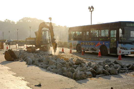 ????11月26日,在市區桂林路,施工人員利用風炮機對龍母廟門前旱橋路面進行破拆。西江都市報記者 何鎏/攝
