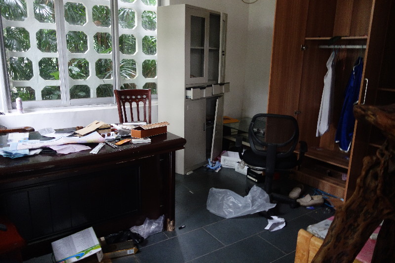 ????目前,該犯罪團(tuán)伙在中山公園北苑的窩點已被警方查出(上圖)。設(shè)在窩點內(nèi)的辦公室里,散落著日常的辦公用品(下圖)。西江都市報記者 高云/攝