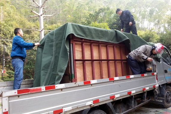 工作人員固定裝有河馬的鐵籠,覆蓋上木板和篷布。記者 何鎏 攝