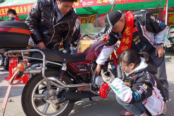 ????走進東出口春運服務站,一塊紅色的“免費維修”牌子很是醒目。龍蟠潤滑油黨支部的黨員義工,就在這里為返鄉的農民工朋友們免費更換摩托車機油、簡單檢修摩托車。