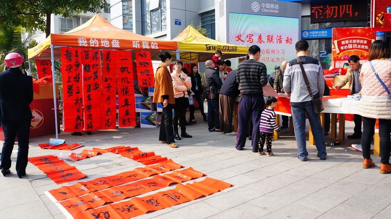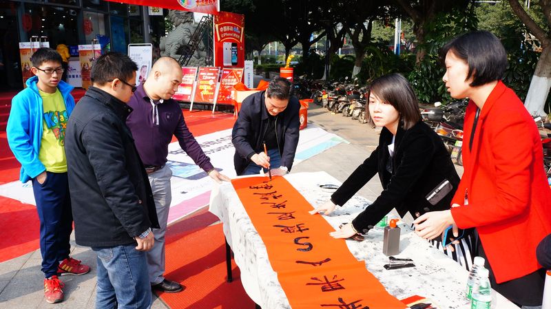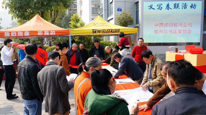 1月29日,中國移動梧州分公司聯合梧州市書法家協會在新興三路移動營業廳前舉行義寫春聯活動,免費為市民寫春聯。