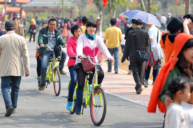 騎自行車在玫瑰湖公園游玩是市民們在今年春節中的新體驗。 記者 何鎏/攝