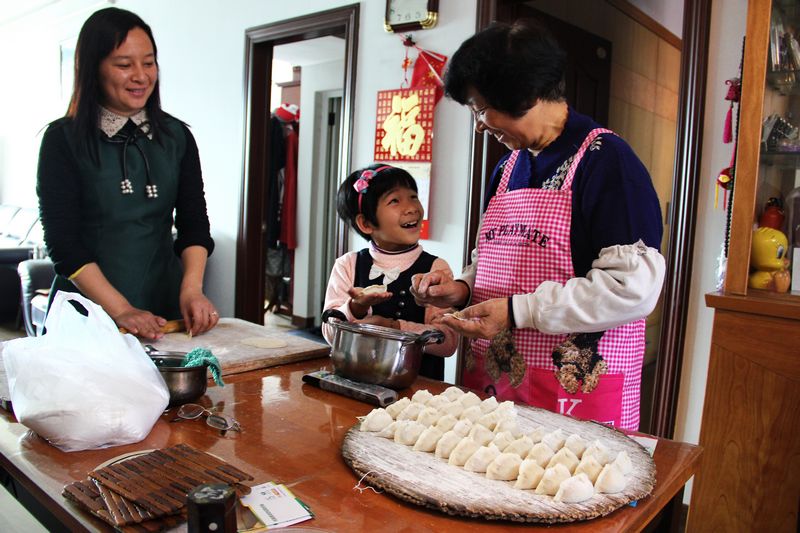 ????溫馨和睦的家庭里,和老人一起包餃子的孫女,忍不住第一時間炫耀著做好的餃子。老人和藹的笑容,讓孫女的信心倍增,一旁的母親也笑了起來。