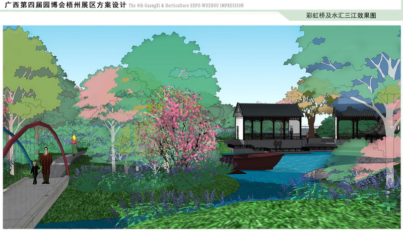 ????作為展園的中心——“長洲島”,將引入展園的江水一分為二。其中一道江水通過“長洲水利樞紐內(nèi)江大壩”匯集在展園中心,形成一片“湖”面,湖邊則是具有嶺南風(fēng)格的親水涼亭、飽含民俗氣息的水上人家建筑和禮艇。另一道江水經(jīng)過“長洲水利樞紐外江船閘”后,流過一條小拱橋。最后,在“鴛江大橋”下,兩條江水匯集,流入園博園的水系中。該處造景真切地模擬了桂江、潯江在梧州鴛江大橋附近交匯,形成滾滾西江向東流去的畫面。