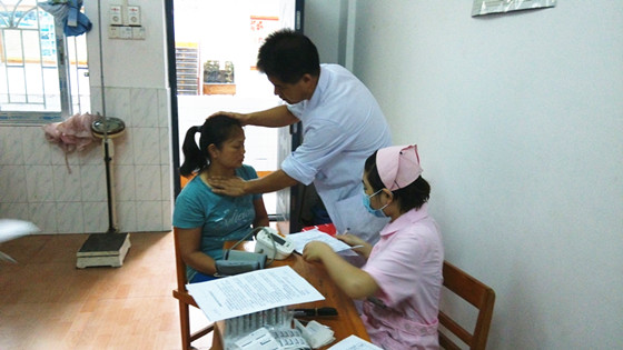 ????6月25日上午,梧州市東興社區衛生服務中心的醫務人員去到轄區內的西環路小學,對約40名校職工及教師展開抽血篩查。記者現場看到,為了避免同名同姓及數據的準確,接受篩查的人員要提供身份證或戶口本,填寫登記項目初篩表及一份關于家族病史和個人健康的調查問卷。隨后,醫生將現場對其進行淋巴結、血壓等初步檢查,以判斷是否符合篩查。