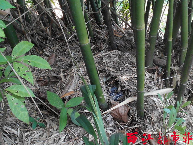 ????8月3日午時,管先生如同往常一樣上礦山鉆探作業(yè),經(jīng)過礦山處的幾棵竹子時,發(fā)現(xiàn)竹叢里的腐葉堆里有一個呈團(tuán)狀的東西。“我走過去細(xì)看才發(fā)現(xiàn)是蛇露出的一截身體,長大約20厘米,蛇身藍(lán)白黑相間有花紋,另外還有兩三顆蛇蛋裸露在腐葉堆外?!惫芟壬貞浬叩哪诱f道,“蛇頭有拳頭大小,蛇身近乎大腿粗!”