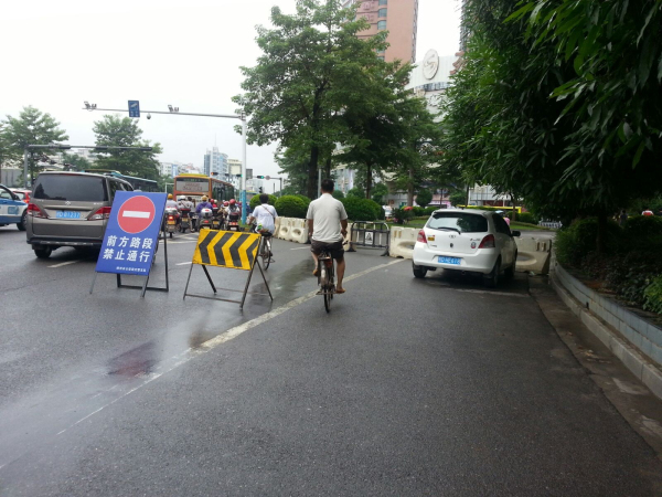 ???? 現場道路實行交通管制,新興二路由西環轉盤往夢之島方面實行單向通行,車輛在交警指揮下有序通行,沒有造成該路段交通出現較大堵塞。