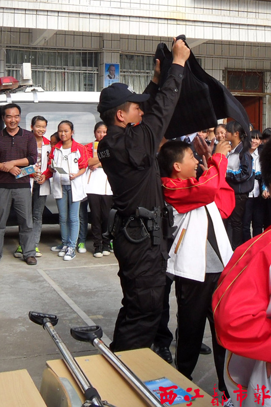 “這是一把多功能警用刺刀。撬開這里,有用以止血的橡皮筋;打開旋鈕,可以用作彈弓和螺絲批。”特警大隊的民警向同學們發放宣傳手冊,展示警用刺刀、防刺服和防暴鋼叉等警用裝備,同學們紛紛試穿起防刺服,在民警的指導下試用警用裝備,大家參與活動十分踴躍。