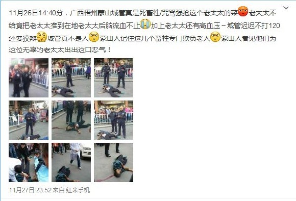 ????梧州零距離網訊 (記者 黃祎婧)日前,有網友在微博爆料,稱11月26日蒙山縣城管推跌一名菜販老太,致其后腦流血不止,并發布了數張現場圖片,圖片里一名老太躺在地上,頭部旁有一灘血水,旁邊有醫護人員和城管工作人員。此消息立即引起了許多網友的關注,在梧州貼吧、本地論壇等平臺不斷被轉發,更有網友稱老太已經不治身亡。今天蒙山縣政府在其官方網站對該事件進行了通報。