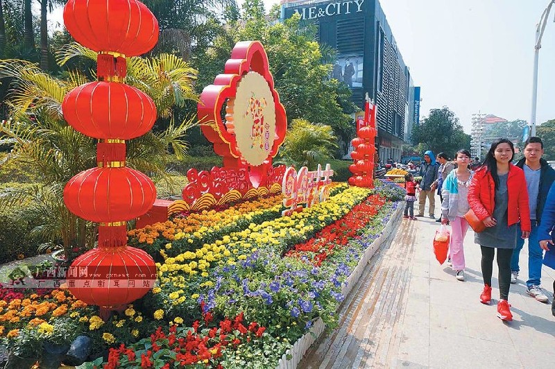 ????春節前夕,百色市政部門組織工作人員在街頭巷尾擺放各式各類的迎春花壇,把羊年新春裝扮得艷麗多姿、年味十足。韋萬忠/攝