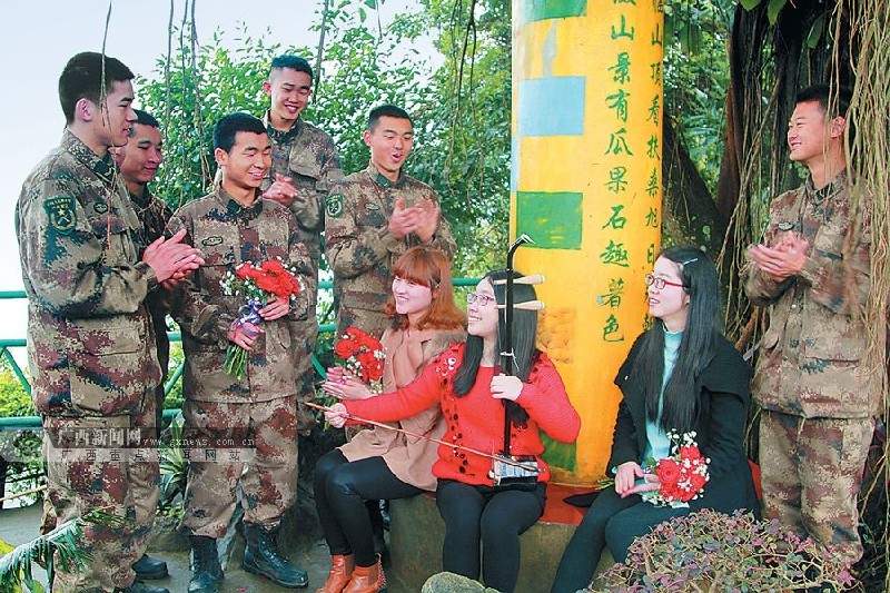節前,廣西邊防部隊某部金雞山哨所,3名年輕軍嫂來到哨所與官兵一起歡度佳節。陳建文/攝 |