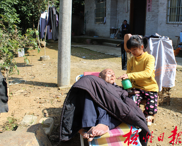 吳天雪為曾外祖父喂水。家里三位生活不能自理的老人全靠9歲的吳天雪來照顧。