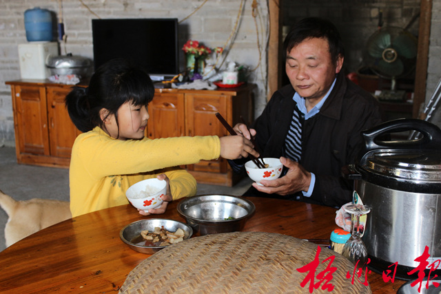 開飯了,她幫外公夾菜。