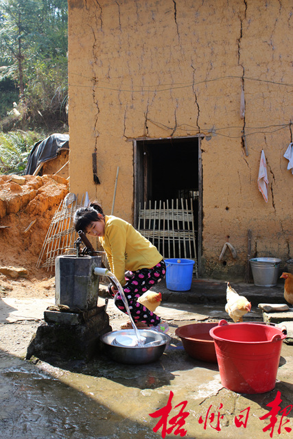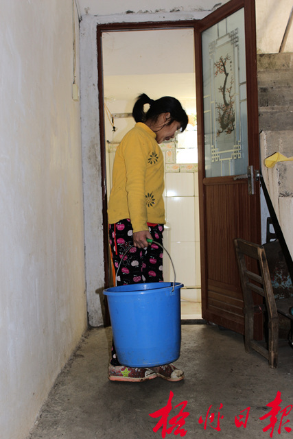 ????很快,吳天雪吃完了粥,她把沒吃完的菜蓋起來,留著中午吃,節省做菜的時間。隨后,她來到天井中的水井旁邊,拿桶放到出水口下,拿起人力抽水泵的手把壓水,水即將上來時有點沉,她把整個身子都壓在手把上,才順利把水汲上流進桶。吳天雪吃力地提起水桶,一拐一搖地抬到一壁之隔的八外叔公江保強家的衛生間,洗刷了馬桶,再提兩桶水來倒進衛生間的水桶里,留著八外叔公沖衛生間。2011年,江保強去醫院檢查被確診為股骨頭壞死,行動愈發不便,單身的八外叔公便跟著天雪曾外祖父、母一起吃住,從此,他家的汲水、洗衛生間、洗菜、淋菜這些家務活也逐漸由小天雪幫著分擔。