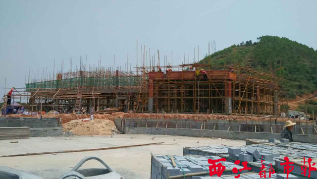????4月23日,園博園梧州園的施工人員正對主建筑物進行外架搭設、綁扎二層鋼筋和安裝模板。