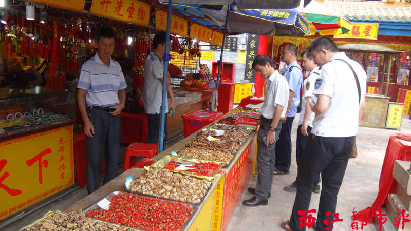 檢查組人員在龍母廟景區(qū)內(nèi)檢查旅游紀念品銷售情況。(潘楚婷/攝)