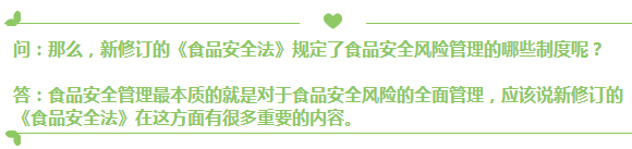 ????2009年的《食品安全法》就體現(xiàn)了食品安全風(fēng)險治理的理念,但是風(fēng)險治理理念貫徹的不徹底。新的《食品安全法》亮點頗多,最重要的是,它確立了食品安全工作的新理念,把風(fēng)險治理的理念貫徹到食品生產(chǎn)經(jīng)營的全過程,即規(guī)定了食品安全工作要實行預(yù)防為主、風(fēng)險管理、全程控制、社會共治的基本原則,建立科學(xué)、嚴(yán)格的監(jiān)管制度。所以這次修法完善了過去的風(fēng)險監(jiān)測和評估制度,增加了分級制度、交流制度、自查制度、約談制度。