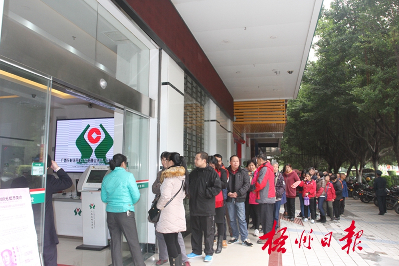 ??? 12月14日上午,梧州市區農村信用合作聯社營業網點門口,等候兌換航天紀念幣的市民排起了長隊。