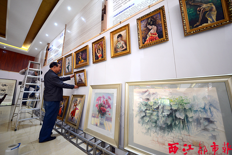 ????1月6日,參加“疊彩飛花落誰家”梧州市第七屆美術書法名家走向藝術市場作品展的畫家,在工作人員的幫助下布置參展書畫作品。 西江都市報記者 蒙紹松/攝