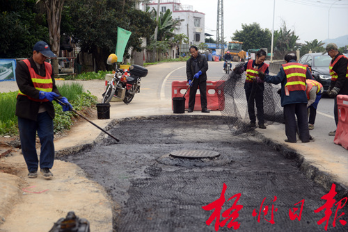 1月19日,在東出口李家莊碼頭附近路段,施工人員正修補路面,確保往來車輛行車安全。 李煜榮 攝