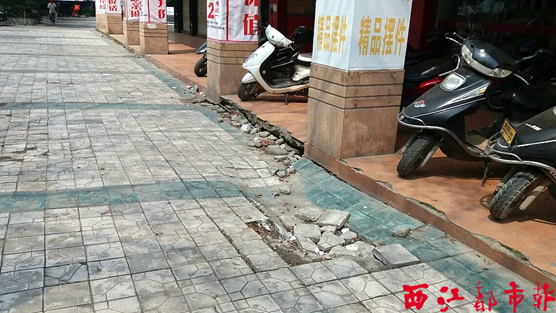 商鋪對(duì)出的路面已出現(xiàn)塌陷的情況,原來鋪砌的瓷磚被壓碎,路面整塊凹陷下去形成一個(gè)坑。 紀(jì)榮蘭/攝