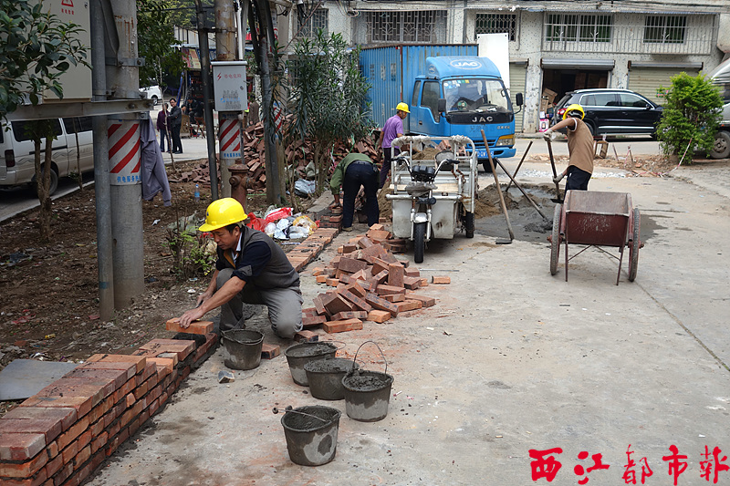 ????12月6日,在長洲區興安小區內,多名工人正在修葺路邊綠化帶的基礎設施。