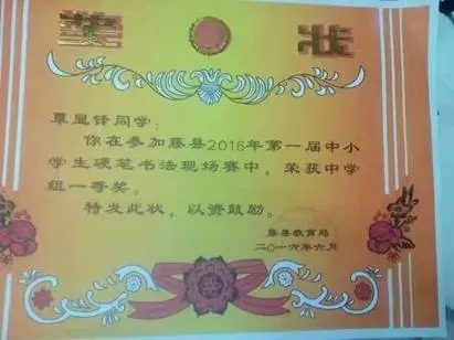 ?阿鋒獲得藤縣2016年第一屆中小學生硬筆書法現場賽中學組一等獎。