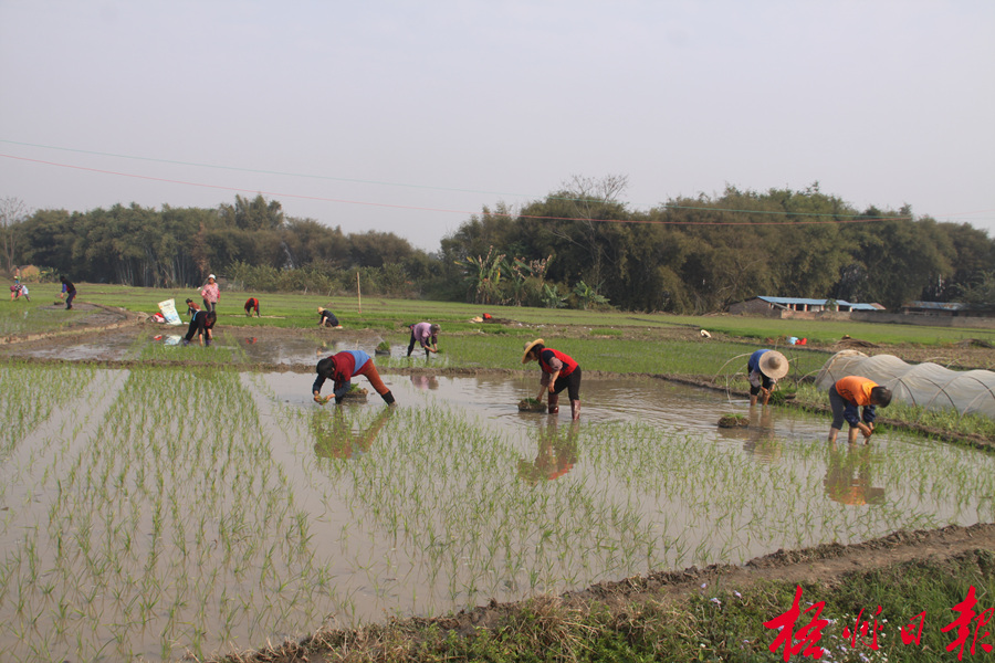 3月3日,在藤縣藤州鎮(zhèn)潭東村,農(nóng)民正栽插雜交水稻母本秧苗。