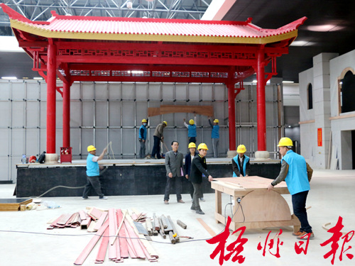 “嶺南古建筑講究精致和一體成形。”余小華介紹說(shuō),位于展示館中央的“戲樓”舞臺(tái)是整個(gè)項(xiàng)目的點(diǎn)睛之作,舞臺(tái)上佇立的亭臺(tái)由上千個(gè)木材部件砌成,使用四根圓木支撐,亭臺(tái)頂部雕刻有規(guī)則圖案的花格,外涂紅漆,顯得莊重質(zhì)樸。為了完成舞臺(tái)設(shè)計(jì),余小華在設(shè)計(jì)初期走訪兩廣地區(qū)保存完好嶺南古建筑群和蒼梧縣六堡鎮(zhèn),采集素材,同時(shí)還尋訪了14名工齡超過(guò)20年的木工工匠組成施工團(tuán)隊(duì),其中,年紀(jì)最大的有70歲。最后,大家耗時(shí)一個(gè)多月才完成舞臺(tái)搭建工作。
