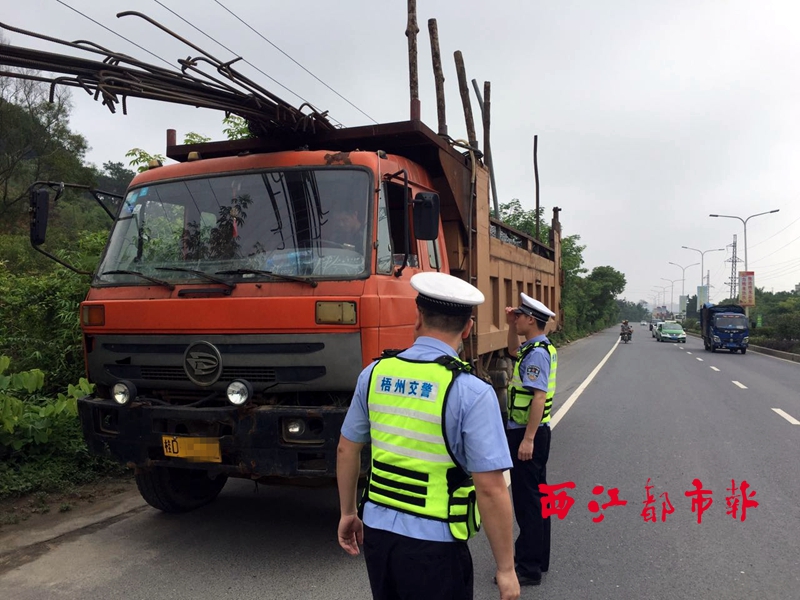 ??? 西江都市報訊(記者 陳雨燕 通訊員 梁穎睿)日前,梧州市公安局交警支隊龍圩交警大隊的民警在巡邏時,查處了一輛桂D牌照的中型自卸貨車。這輛貨車拉了一整車遠超車身長度的鋼筋條,在城東五路蒼海公園對出路段搖搖晃晃地行駛,執勤民警發現后,立即截停了該貨車,對駕駛員進行相關安全教育后,依法給予處罰。