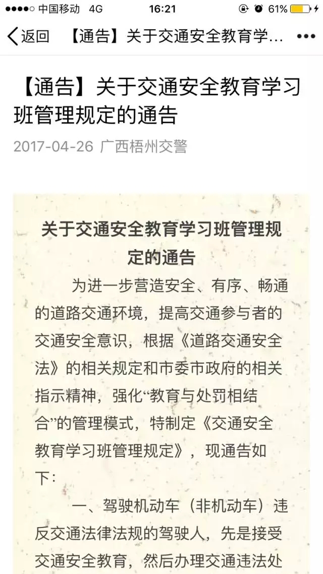 ??? 4月26日,梧州市公安局交通警察支隊(duì)通過微信公眾號發(fā)布《關(guān)于交通安全教育學(xué)習(xí)班管理規(guī)定的通告》,通告指出,為了強(qiáng)化“教育與處罰相結(jié)合”的管理模式,特出臺(tái)本規(guī)定。按照通告規(guī)定,駕駛機(jī)動(dòng)車(非機(jī)動(dòng)車)違反交通法律法規(guī)的駕駛?cè)耍仨毾冉邮芙煌ò踩逃_(dá)到2小時(shí)(含觀看視頻或警員講授),然后才能辦理交通違法處罰手續(xù)。這項(xiàng)規(guī)定自公布之日執(zhí)行。