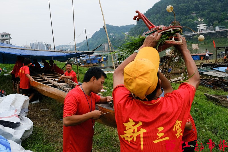5月18日,在龍舟下水前,新三云酒家隊(duì)的隊(duì)員將一把草放進(jìn)“龍嘴”,寓意將“龍”喂飽了,“龍”才有力氣出賽。