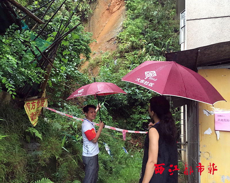 ????6月21日下午,天降大雨,大東社區工作人員來到石鼓路350號的地災隱患點巡查,入戶提醒居民注意防范地質災害。西江都市報記者 謝韻 攝影報道