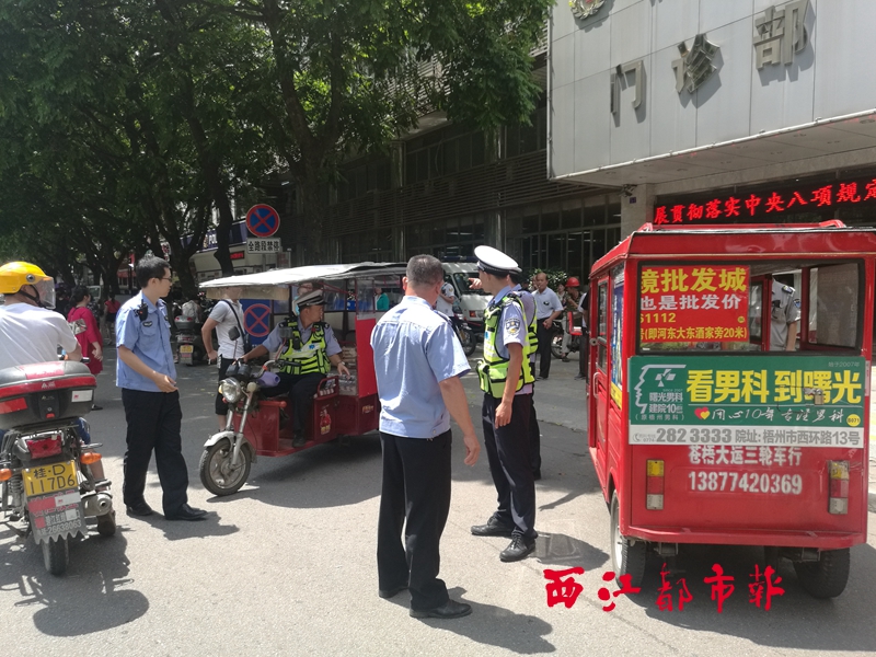 ??? 6月24日,梧州市城管和交警部門再次聯合執法,對梧州市紅十字會醫院門前的車輛亂停放、攤檔亂擺賣等市容環境亂象進行整治。