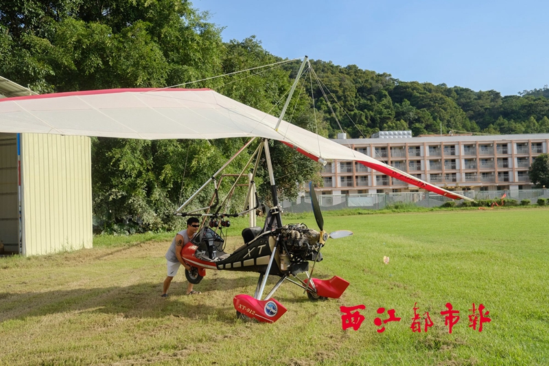 ??? 隨著動(dòng)力三角翼尾部的螺旋槳快速轉(zhuǎn)動(dòng),梧州國(guó)家體育訓(xùn)練基地草坪上蕩起層層碧浪?;幸欢尉嚯x后,這架紅白顏色相間的動(dòng)力三角翼帶著駕駛員扈劍及體驗(yàn)者梁先生,徑直向他們向往的藍(lán)天飛去。