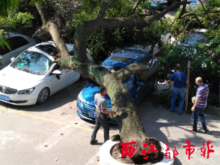 ????9月8日?,在藤縣政府大院內,一棵大樹將幾輛小轎車壓住。