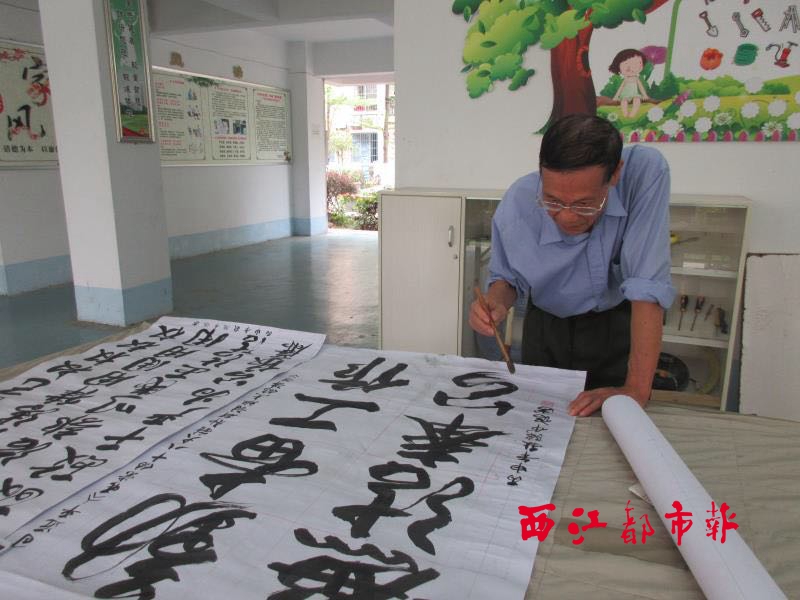 ????從那時開始,陸中識“承包”了藍天社區會議條幅、節日宣傳標語、社區居民文化室展覽的制作。最近,藍天社區舉辦“兩學一做”學習教育、“黨風家風”活動,陸中識根據社區工作人員提供的材料,很快制作了一個生動、活潑的“廉政宣傳欄”手抄板報。除了幫助社區,陸中識還經常給社區居民義務寫對聯和感謝信。