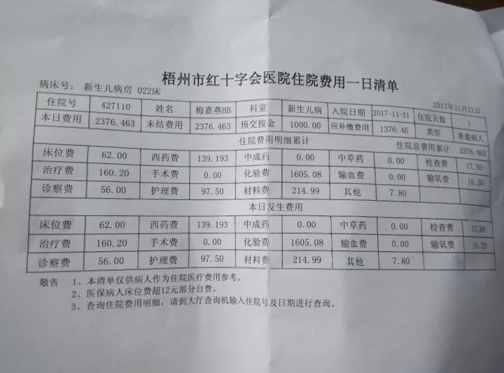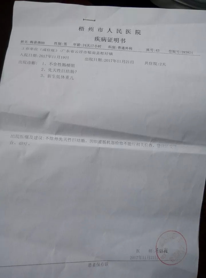 之后,孩子轉院到了梧州市人民醫院,經診斷患有不全性腸梗阻、新生低體重兒,不排除患有先天性巨結腸的可能。11月21日,孩子又轉院至梧州市紅會醫院進行診治。“孩子一直處于高燒狀態,腸壞死,甲功五項超標,可能將影響智力發育。紅會醫院的醫生說孩子要在ICU持續治療觀察2個星期左右,等病情穩定些后再決定要不要做手術。”