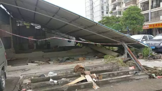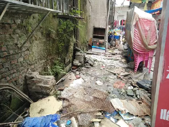 住宅樓旁鐵棚坍塌,垃圾堆放在路邊。陳業漾攝