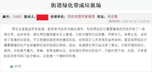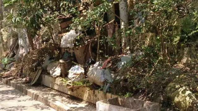 網友反映,在石鼓路旁一小巷,即原石鼓居委會所在街道,原地區行署圍墻旁的綠化帶植物無人管理,大部分植物已經枯萎,垃圾堆放在圍墻邊,引來老鼠、蒼蠅成群。