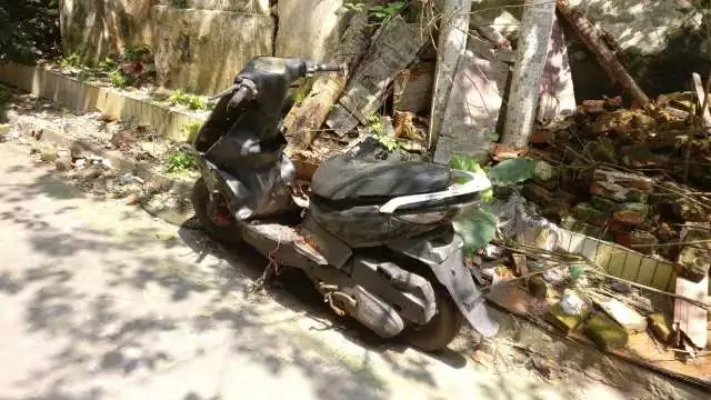 廢棄鐵棚周圍,車輛停在人行道上。陳業漾攝