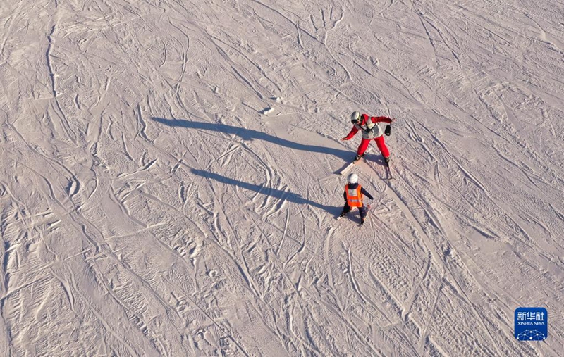 在長白山國際度假區滑雪場,一名小朋友在滑雪教練的指導下學習滑雪(11月19日攝,無人機照片)。