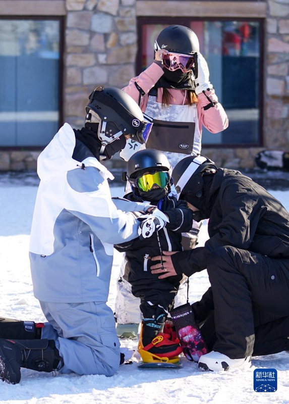 在長白山國際度假區滑雪場,家長為一名小朋友穿戴滑雪裝備(11月19日攝)。