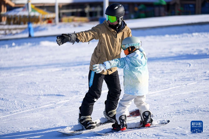 在長白山國際度假區滑雪場,一名小朋友在父親的指導下學習滑雪(11月19日攝)。
